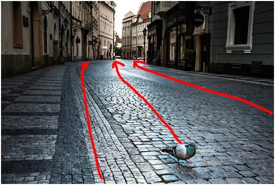 這張圖是布拉格阿的一個(gè)早晨,大概是早上五點(diǎn)多鐘,路上很安靜,天開始蒙蒙亮,我就拍了一張很安靜的街道,首先看到的興趣點(diǎn)是一只鴿子。路面形成的引導(dǎo)線以及通過路面反光形成的引導(dǎo)線來達(dá)到的,把目光從這只鴿子引向遠(yuǎn)方。