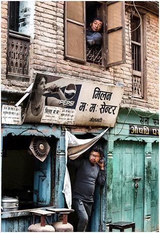 上面這兩張圖第一張,歸類為半包圍。第二張圖也是半包圍,在尼泊爾的一個(gè)小鎮(zhèn)拍的,旁邊兩個(gè)人是背影,實(shí)際上把這個(gè)人夾在中間,所以這個(gè)人特別容易引起你的注意,形成了一種包圍趨勢,在電影的鏡頭語言中運(yùn)用的比較多。