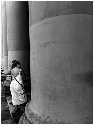第一張圖也是在街上拍的,女人肯定在與柱子后面的人在交流,是什么樣的人?他們在做什么?其實(shí)都留給了觀者,這就屬于開放式構(gòu)圖。