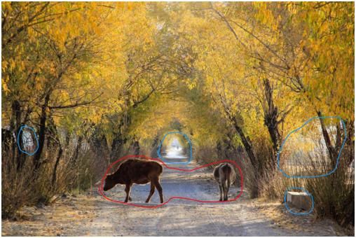 這幅片子用藍(lán)色部分標(biāo)注出來的地方,都是相對比較亮的有高光的地方,它們對照片中的主體(圈起的紅色部分),兩只牛形成了干擾,使得觀看者的目光不能集中在主體身上,總是被這幾個(gè)藍(lán)色高光部分所吸引。