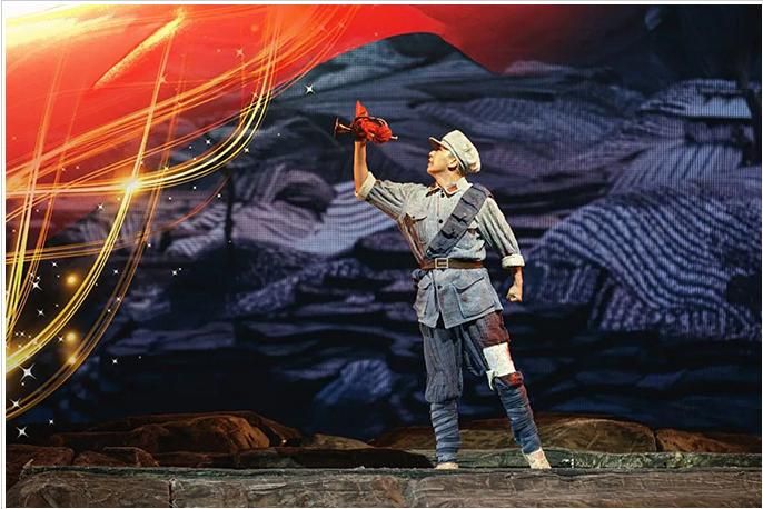 《花兒與號(hào)手》是一部以紅軍長(zhǎng)征路過六盤山為背景創(chuàng)作的音樂劇,全劇展現(xiàn)了長(zhǎng)征路上紅軍戰(zhàn)士的理想信念和“長(zhǎng)征是宣言書、是宣傳隊(duì)、是播種機(jī)”這一核心思想,弘揚(yáng)了中國(guó)共產(chǎn)黨百年征程中展現(xiàn)出的無私無畏的革命精神。