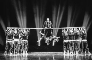 在靜謐的夜空下,首先映入觀眾眼簾的是群舞演員在舞臺(tái)中央,用身體構(gòu)建的人字形“情人房”。房?jī)?nèi)的瑤族姑娘正在小憩,或許是被屋外的動(dòng)靜驚醒,她推門(mén)出外察看,重重的門(mén)軸聲劃破了夜的寂靜,原來(lái)是愛(ài)慕者正攀在一根竹竿上向自己示愛(ài)。“無(wú)竹不成瑤”,舞蹈伊始,最核心的道具——一根長(zhǎng)約8米、杯口粗的竹竿就出現(xiàn)了。借助竹竿,群舞演員通過(guò)造型組合及隊(duì)形變換,不斷再現(xiàn)生活場(chǎng)景:山坡上、小橋上、屋檐下、窗欞邊……情隨景遷、情景交融,生活圖景和人物情緒巧妙地融合在一起,營(yíng)造出一種別樣的意境,極大地引發(fā)了觀眾的聯(lián)想。