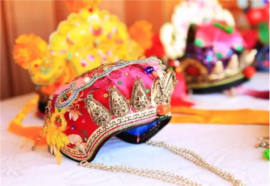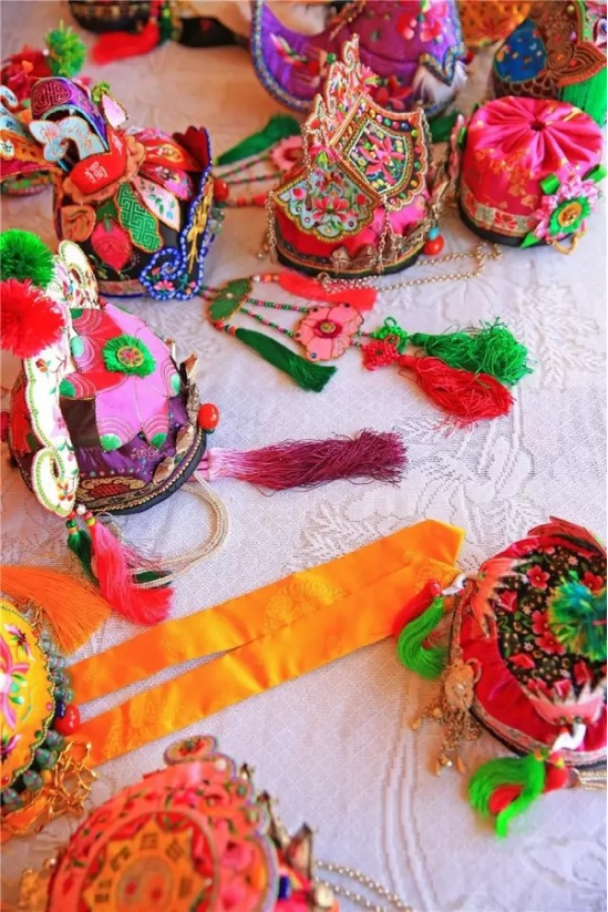 走進楊文煥的工作室,猶如進入一個明媚鮮艷的夢境。首先映入眼簾的,便是那一頂頂色彩鮮艷、繡工精致的童帽:造型大方、線條流暢的獅子帽;色彩明艷、虎虎生威的老虎帽;精巧別致、活潑可愛的翹尾帽;高雅富麗、古韻悠長的公子帽;別具一格、特色鮮明的牌坊帽。