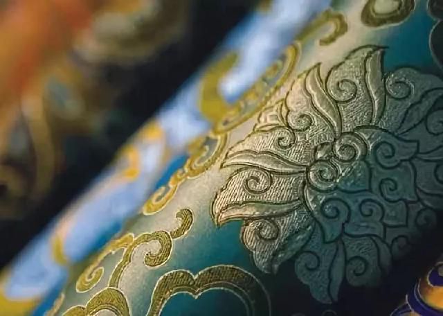 民族錦一般采用多色彩條嵌入金銀絲織成,多用于民族服飾,故名。其特點(diǎn)是錦面上的圖案從經(jīng)緯線交織中顯現(xiàn)出自然光彩,富有光澤。常見的圖案有團(tuán)花、葵花、“萬(wàn)”字“壽”字等。彩暈錦的特點(diǎn)是織紋華貴相映,明暗匹配,層次分明,并以色暈過(guò)渡,花紋絢麗多彩,別具一格。