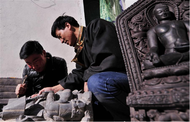 伴隨著收音機傳出的旋律,西藏自治區(qū)級黑玉石雕刻技藝非物質(zhì)文化遺產(chǎn)傳承人土登加措和他的徒弟們開始了又一天的黑玉石佛像雕刻工作。黑玉石產(chǎn)生于海拔4500米以上的石山上,是高原特有的一種石材。據(jù)古書記載,西藏第一代藏王聶赤贊普曾將天降的經(jīng)書、塔模等佛教圣物封存于洞中,并以黑玉石雕刻佛塔做蓋,于是便有了西藏歷史上有記載的第一件黑玉石雕刻作品。作為這門技藝的第五代傳人,土登加措延續(xù)著家族的技藝,一直傳承著這門古老的技藝。西藏黑玉石雕刻技藝在2012年入選第四批西藏自治區(qū)級非物質(zhì)文化遺產(chǎn)名錄,土登加措如今已有近30名弟子,古老的黑玉石雕刻技藝正在慢慢走向世界。新華社記者 晉美多吉 攝