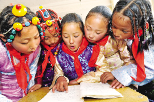 西藏昌都地區(qū)實(shí)驗(yàn)小學(xué)的學(xué)生們?cè)谝黄鹉钫n文