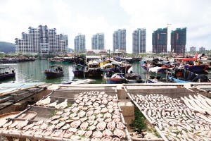 疍家人晾曬海魚的對(duì)面聳立著一座座高樓(2007年攝)。