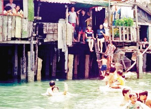 三亞疍家人昔日賴以生存的“疍家棚”,全家老小吃住都在一個(gè)棚里。孩子們戲水游玩就在疍家棚前,熱鬧非凡(1997年攝)。