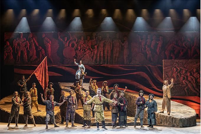 在舞蹈語言的設(shè)計上,編導融入當代元素,使觀眾不但感受到審美的親切與現(xiàn)代感,而且還自然地進入回望歷史的情境,對其思想內(nèi)涵的理解更為準確。該劇的道具使用和調(diào)度也頗為大氣,令人印象深刻。一組斜坡狀的大型舞臺道具不但由群眾演員直接移動而實現(xiàn)即時的場景調(diào)度,還可使演員上下和左右而行,最終組合成巨大的中國共產(chǎn)黨黨徽,輔助完成了人民英靈和英雄的形象塑造。