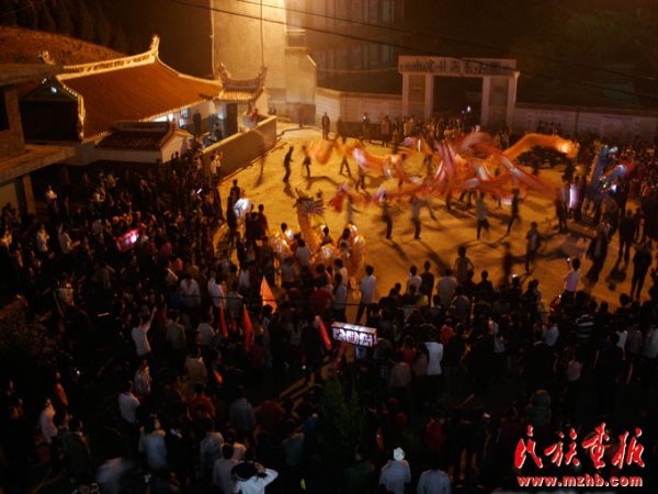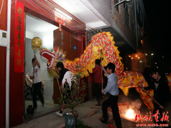 鼓聲起,鑼鼓響,鞭炮鳴。一片歡呼聲中,“龍”忽上忽下,左搖右擺地從承啟樓游出。由于五云樓是幾座土樓中最老的一座,里面還供奉著江集成及其夫人的塑像,所以拜訪從那里開始。進(jìn)入五云樓,“龍”首先來到中堂,三鞠躬,敬拜祖先和觀音。然后,“龍”開始去樓里每戶家里拜訪,各家紛紛燃放鞭炮迎接龍的到來。從五云樓出來后,“龍”前往保生大帝廟參拜諸神。據(jù)記者觀察,只要途中路過寺廟佛堂和樹神所在地,“龍”都會(huì)去參拜。