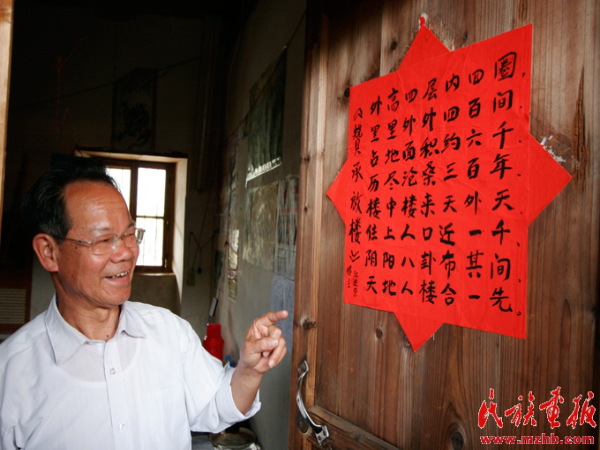 當(dāng)過小學(xué)老師的江進(jìn)榮為游客介紹承啟樓,還專門寫了首詩