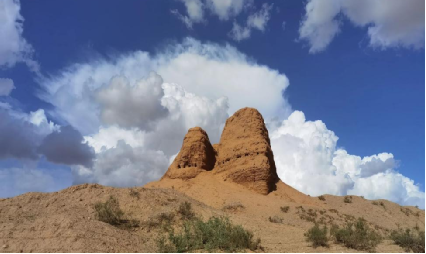 (東紅烽火臺,位于海南區(qū)巴音陶亥鎮(zhèn)東紅村,整體為紅黏土夯筑而成,現(xiàn)高9.3米)