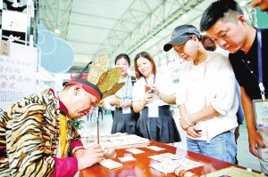 在云南文博會(huì)上,來自麗江的納西族東巴文化傳承人現(xiàn)場(chǎng)展示東巴文字的書寫方法。 張彤?dāng)z
