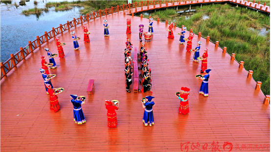 都安各族群眾在澄江國(guó)家濕地公園表演打扁擔(dān)。