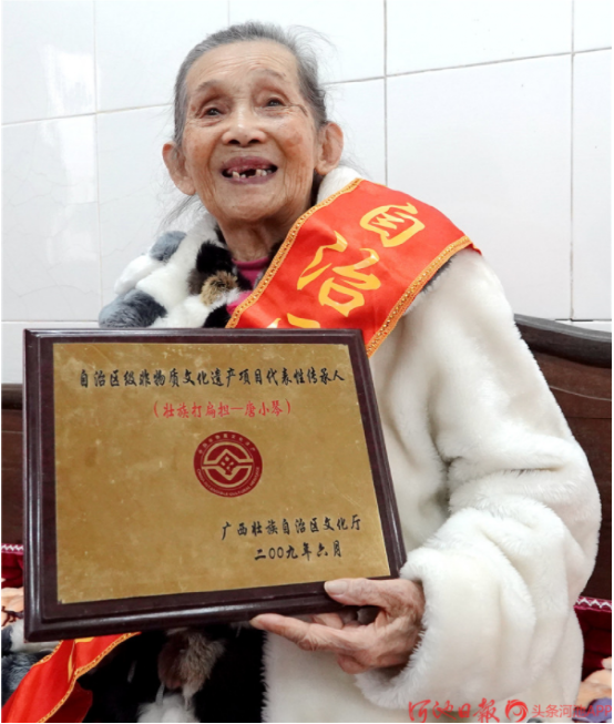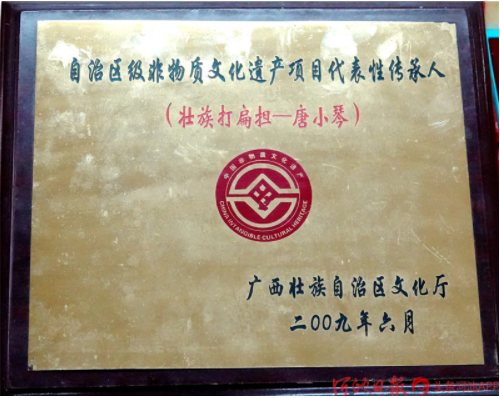 今年已經(jīng)88歲高齡的“壯族打扁擔(dān)”技藝傳承人唐小琴,她從小即耳濡目染,跟村里老人、長(zhǎng)者學(xué)習(xí)打扁擔(dān),后因打扁擔(dān)需要指揮,又學(xué)習(xí)皮鼓打法。1961年4月,唐小琴?gòu)膶W(xué)校調(diào)入縣文化館任文化藝術(shù)輔導(dǎo)員,挖掘整理了《壯族打扁擔(dān)》《板凳舞》《斑鳩舞》等一大批傳統(tǒng)舞蹈,并多次在自治區(qū)、河池地區(qū)的比賽、調(diào)演上獲獎(jiǎng)。1986年退休后,仍然致力于《壯族打扁擔(dān)》的傳承工作,2004年,組建都安縣老干康樂(lè)藝術(shù)團(tuán),帶動(dòng)安陽(yáng)鎮(zhèn)退休老人學(xué)習(xí)打扁擔(dān)技藝。2009年,她被確認(rèn)為自治區(qū)非物質(zhì)文物遺產(chǎn)項(xiàng)目“壯族打扁擔(dān)”代表性傳承人。