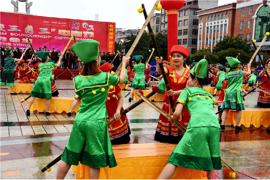 都安縣500名群眾歡聚一堂,打起扁擔(dān),喜迎“三月三”。