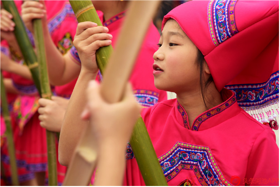 一群少年兒童歡聚在都安縣文體廣場(chǎng)打起扁擔(dān),喜迎三月三。