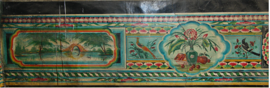達(dá)拉特旗地區(qū)的墻圍畫高度一般在70厘米左右,其長(zhǎng)度則依炕的大小而定。炕上部分的畫是主體,在結(jié)構(gòu)上有一套固定的模式,即以上下兩組邊道,按照一定的規(guī)格布置形成主體框架,中間等距離安排各種畫空,既具完整對(duì)稱的裝飾形式美感,又具簡(jiǎn)繁對(duì)比、主從相映的豐富表現(xiàn)內(nèi)涵。邊道圖案種類繁多,有折子邊、卷帶邊、竹筒邊、花邊等。畫空也稱“池子”,有正方形、長(zhǎng)方形、扇形、圓形等多種形式。此外,在下邊道與炕距離25-30厘米的范圍內(nèi)是黃顏色的邊子,這樣的設(shè)計(jì)是避免炕上物件的遮擋和抬高人的視線,便于觀賞。