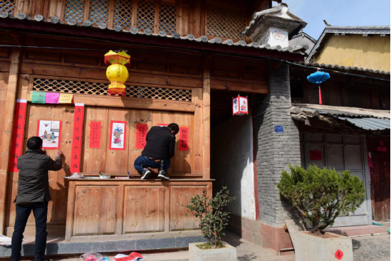寫春聯(lián)繪年畫的傳統(tǒng)在劍川縣金華鎮(zhèn)由來已久,明朝洪武年間改土歸流和移民屯邊制度的推行,使儒家文化、理學思想逐漸融入邊疆人民的生活。金華古鎮(zhèn)居民受此影響,走上追求仕途功名的道路,文人鄉(xiāng)紳都以顯示儒學身份為榮。每逢春節(jié),人們會邀請有功名的仕子或傳學明經(jīng)的文人來到家中,撰寫對聯(lián),同時根據(jù)時令畫上一兩幅門神畫,希望通過此舉祈愿自家后生求得功名。如今走在金華古鎮(zhèn)西門街上,仍能看到家家種花養(yǎng)草,戶戶楹聯(lián)盈門,一派文風蔚然的生機。