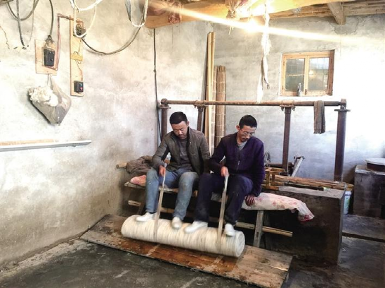 接著,父子幾人配合著,開始蹬簾子步驟?!皳{簾子的步驟最關(guān)鍵?!倍藕C髡f,蹬簾子的時(shí)候,蹬的時(shí)間長了不行,短了也不行,要掌握好時(shí)間,才能達(dá)到最好的效果。“哪都需要精細(xì)化,稍不精細(xì)就會(huì)出現(xiàn)氈散了、爛了,做不成功就廢了?!闭f著,杜占財(cái)和杜占福在杜海明的帶領(lǐng)下,三人用雙腳,來來回回仔細(xì)地進(jìn)行著搟簾子。