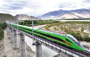 蒼翠的雅魯藏布江河谷中,全新的復興號列車呼嘯而過,與奔騰的江水一起向著“西藏江南”林芝駛?cè)ァ?/p>