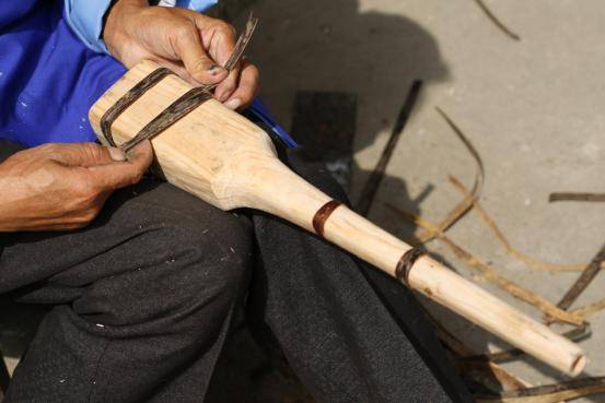 制作蘆笙大的工序有12道,再細(xì)一點(diǎn)有幾十項(xiàng)。如第一道是到山上去選竹子,拿尺子慢慢比劃,三拳的有多長(zhǎng),要很細(xì)心地選,確實(shí)可以用。取下來(lái)之后,第二道工序是拿到河邊去洗,用紗布搓。因?yàn)橹窆苡泻芏喟唿c(diǎn),關(guān)節(jié)處有很多毛,要很細(xì)致的把那些東西全搓掉。弄好之后用太陽(yáng)曬,曬干曬白。第三道工序,就是取杉樹(shù)的木頭做笙斗,計(jì)劃好做三拳的是多少公分,四拳是多少公分。十二道工序,后面越學(xué)越復(fù)雜,每一道工序都很講究。