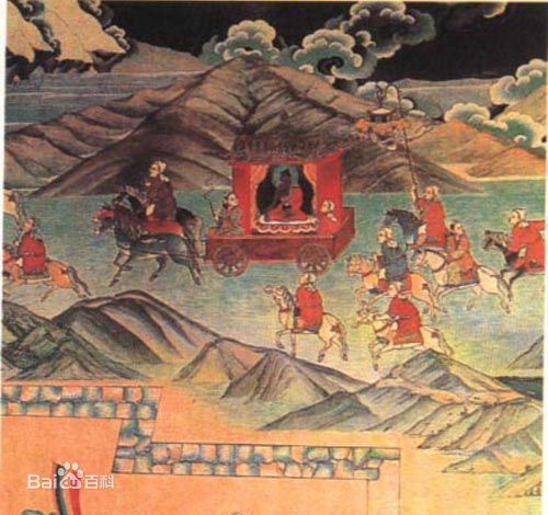 貞觀15年(641)正月十五,唐太宗將文成公主下嫁松贊干布,詔令江夏王李道宗持節(jié)護(hù)送。文成公主在唐送親使江夏王太宗族弟李道宗和吐蕃迎親專使祿東贊的伴隨下,前往吐蕃。文成公主一行從長(zhǎng)安出發(fā),途經(jīng)西寧,翻日月山,長(zhǎng)途跋涉到達(dá)拉薩。 松贊干布率群臣到河源附近的柏海(今青?,敹嗫h境內(nèi))迎接文成公主,謁見(jiàn)李道宗,行子婿之禮。之后與公主同返邏些(今拉薩),為公主筑城、修建宮室。