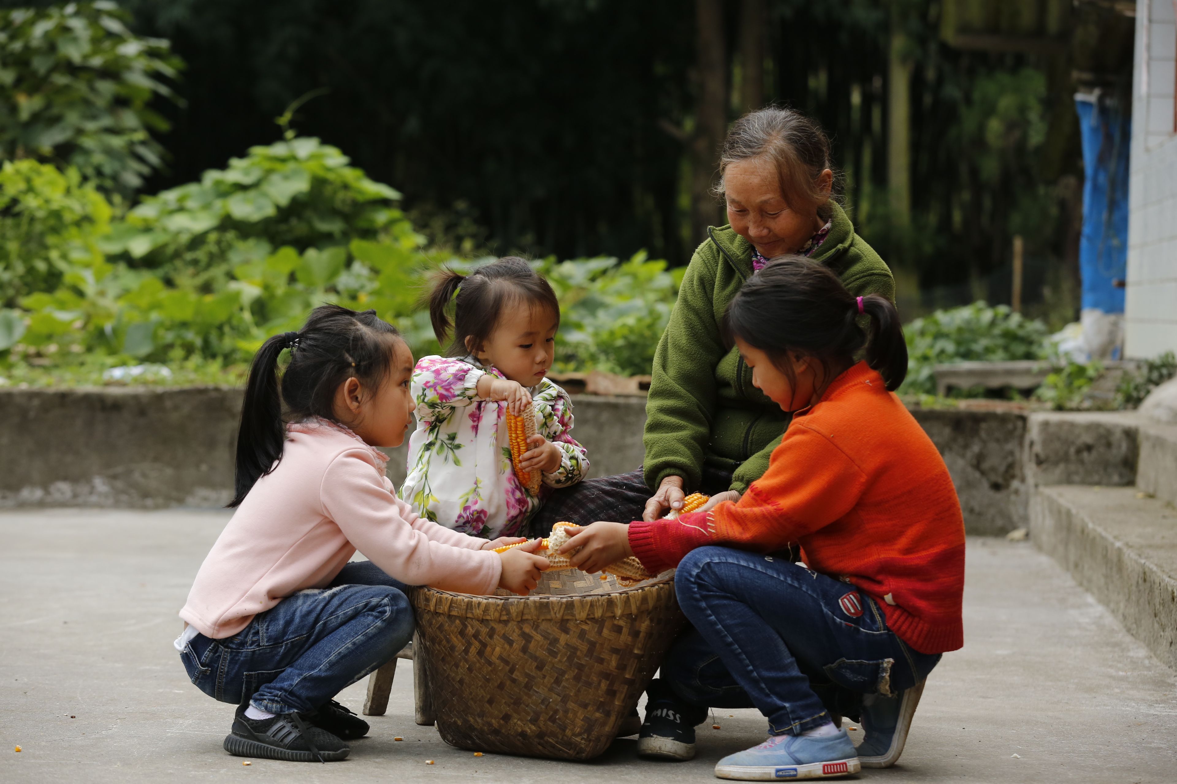 苗族老年人與兒童剝玉米3